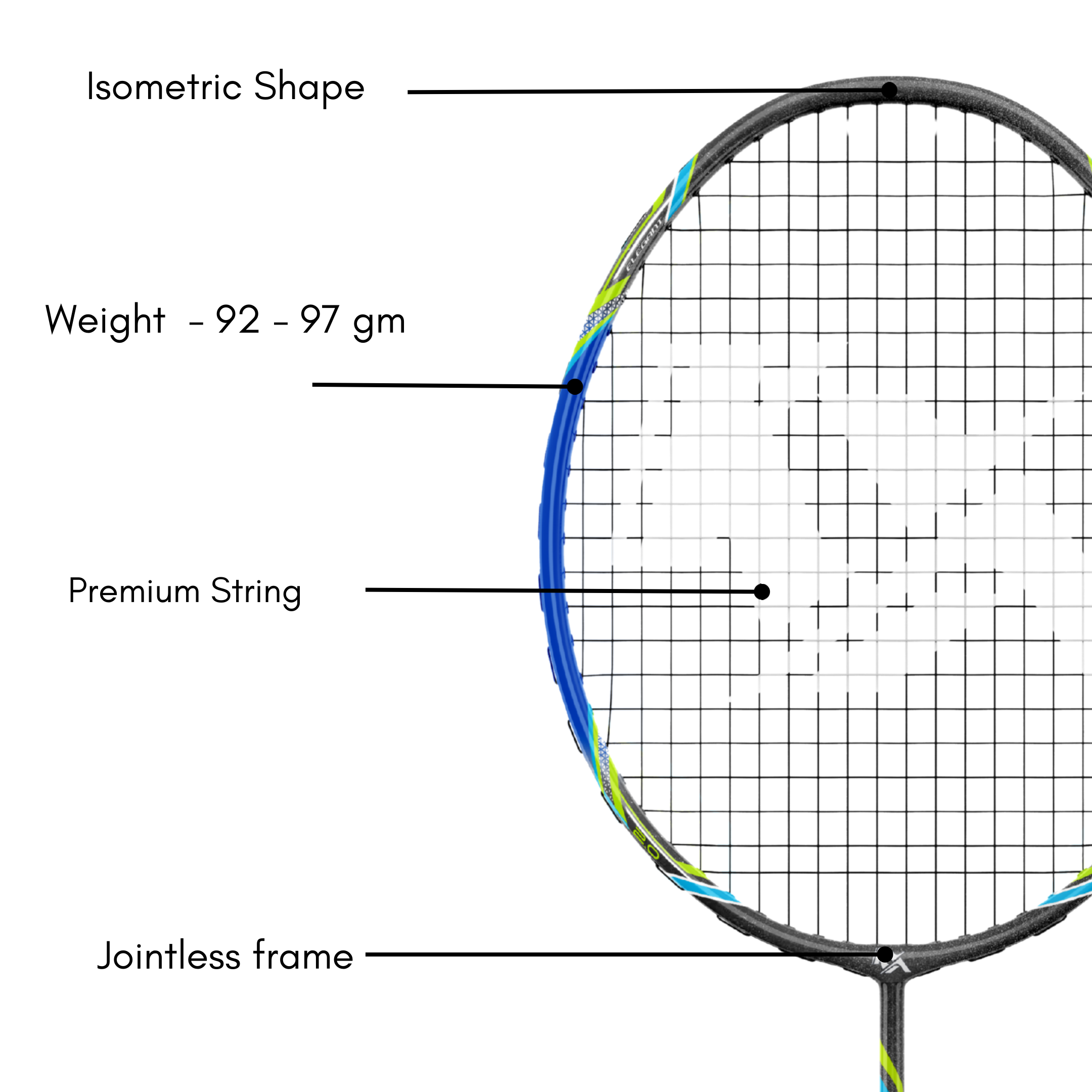 With an isometric head shape, the Elegant racket offers a larger sweet spot, allowing players to generate better power and accuracy even when shots are not perfectly centered. Weighing between 92–97 grams, the racket maintains a lightweight yet stable feel, supporting smooth swings, quick reactions, and controlled gameplay.