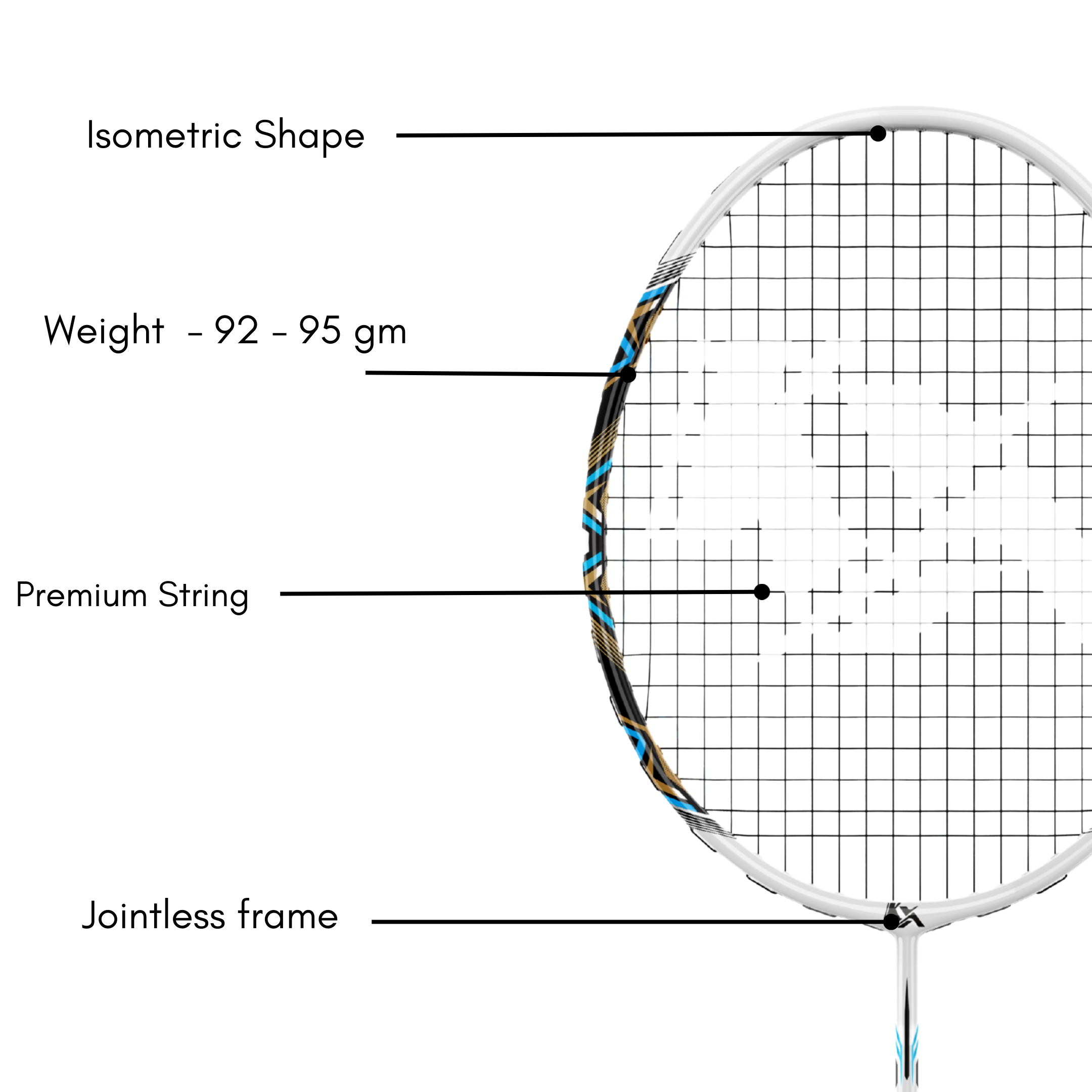 The racket is constructed with a strong aluminium frame, providing high impact resistance and long-lasting durability, especially beneficial for frequent use in training environments. The carbon shaft enhances flexibility and control, offering smoother swings, improved shot accuracy, and reduced vibration during powerful strokes. Its built-in T-joint adds structural stability to the frame, ensuring better energy transfer and extended racket life.