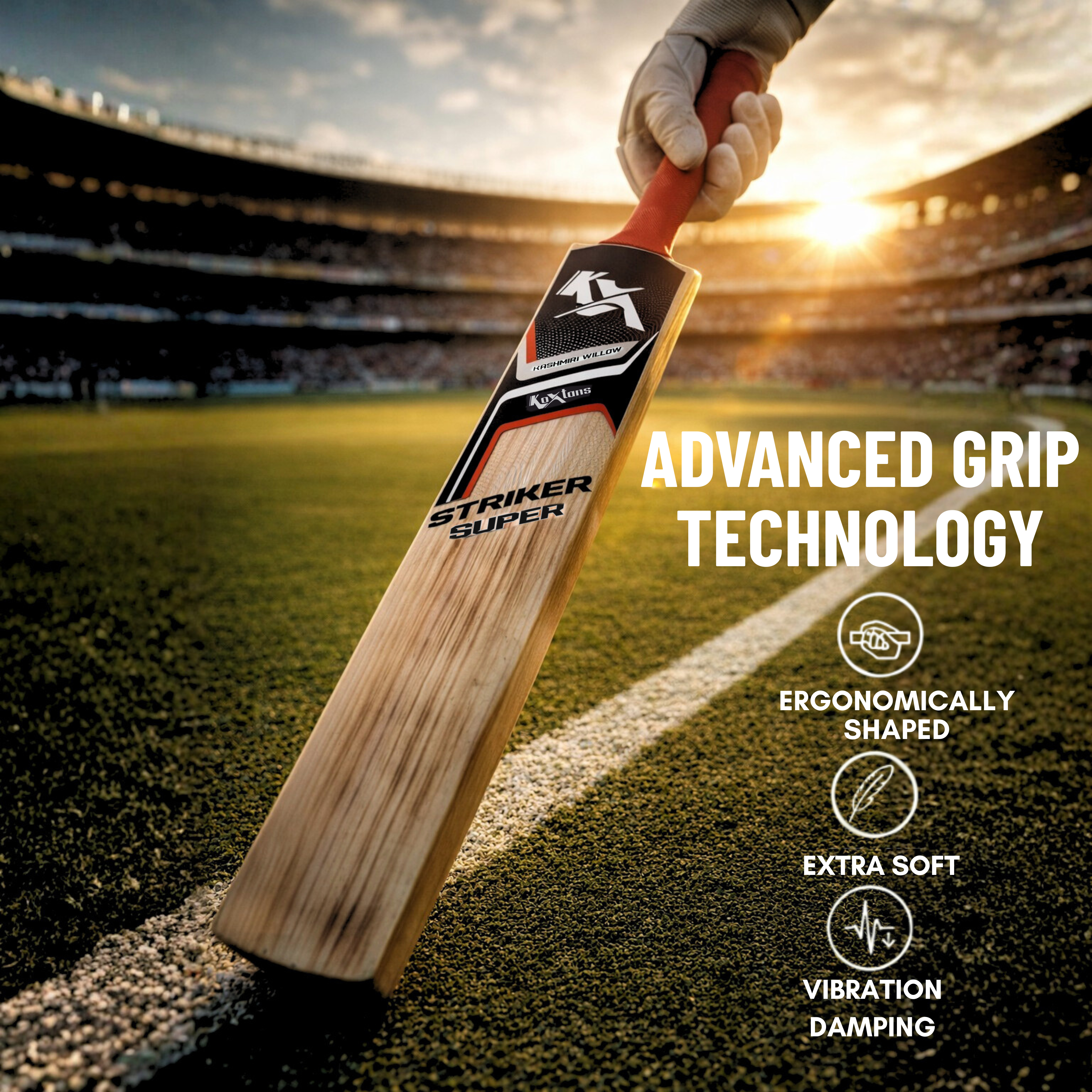 The bat is fitted with a premium rubberized soft grip, offering superior comfort, sweat control, and a firm hold for longer playing sessions. The balanced handle design reduces vibration and improves control, helping players play longer innings with confidence.